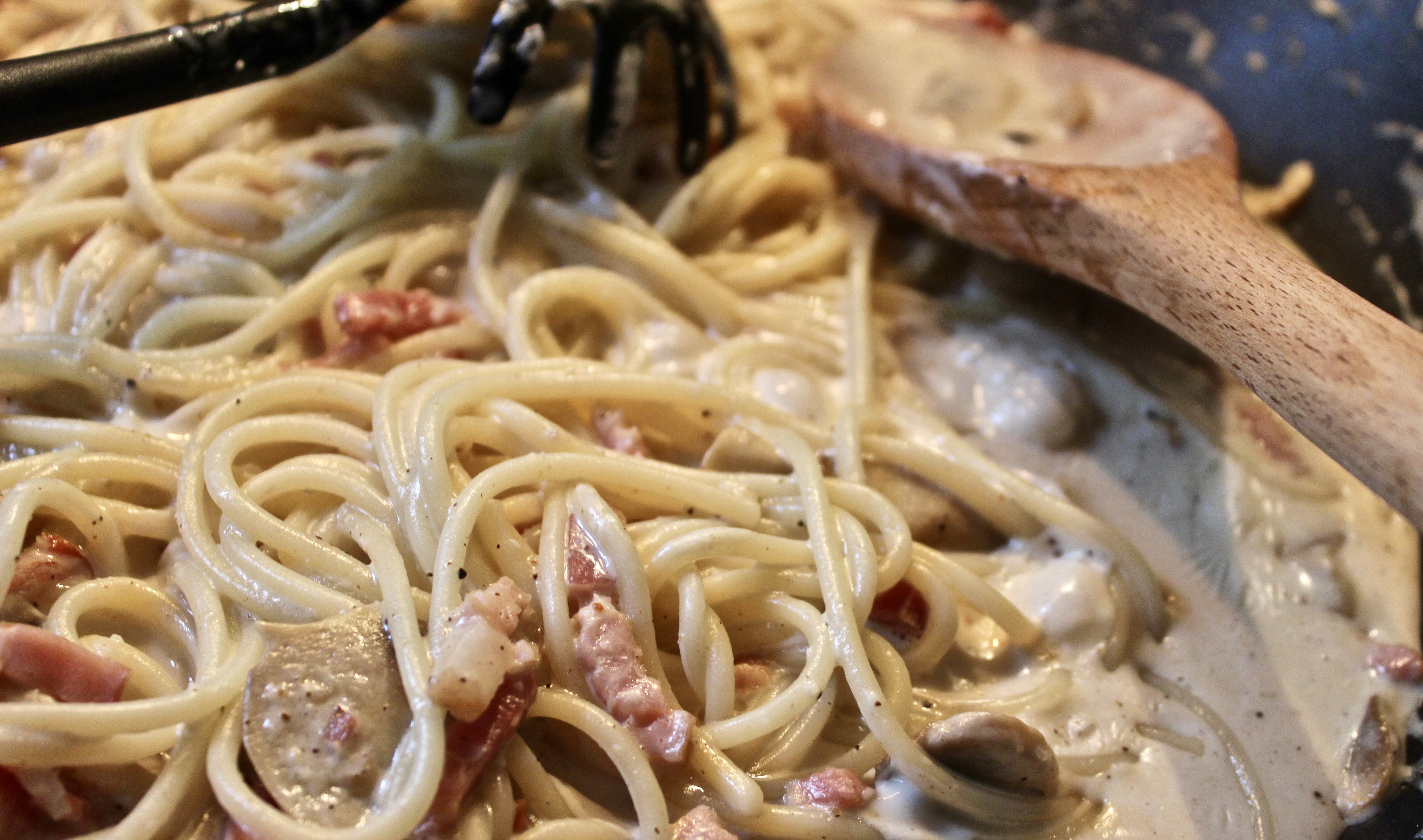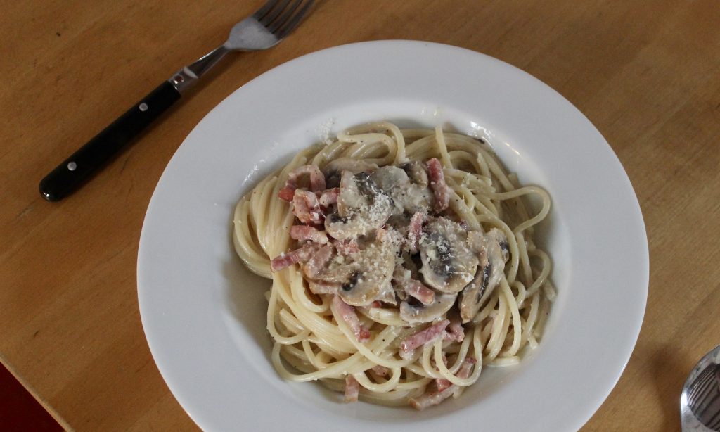 Put some olive oil in a wok pan. Add the sliced mushrooms and some garlic and pepper. When the mushrooms are golden brown, add the bacon. When the bacon is cooked, add the cooking cream and some nutmeg. If you want to add little frankfurter sausages to your pasta (extra yummy!), add them after you’ve added the cream. When the cream starts boiling, add parmesan cheese and stir. Add more herbs by flavour.