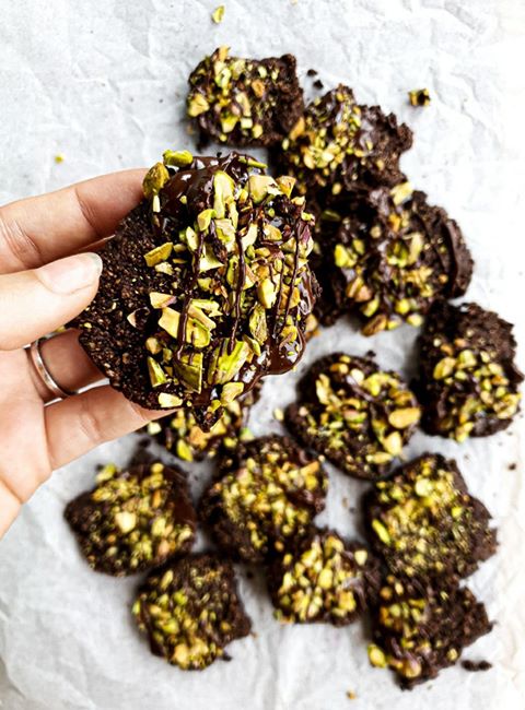 -Baña las galletas con el chocolate fundido (tanto como quieras) y pónles los pistachos picaditos antes de que solidifique.