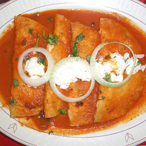 3. Las tortillas de maíz se pasan por aceite caliente y luego por la salsa, se rellenan con el queso, y doblándolas se hacen los taquitos que se acomodan en un plato, se bañan con el resto de la salsa y luego con la crema.